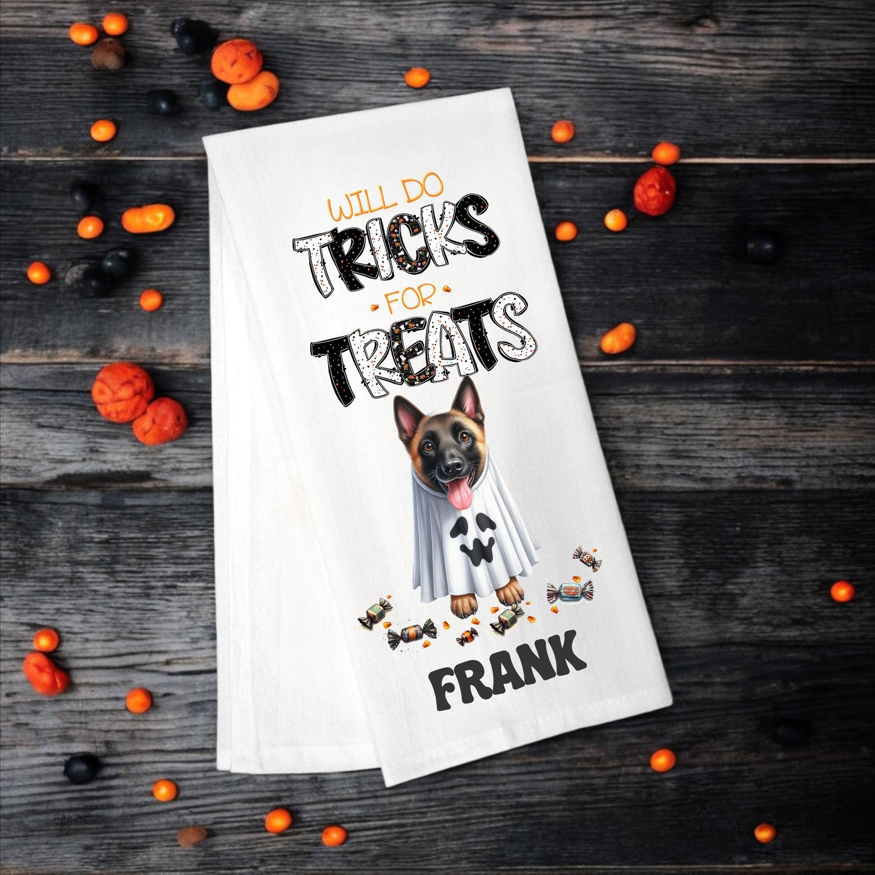 Add a spooky touch to your kitchen this Halloween with our "Will Do Tricks for Treats" Tea Towel featuring a loyal Belgian Malinois! Perfect for Malinois moms and dog lovers, this flour sack kitchen towel is both charming and functional. Use it as a dish towel or a decorative piece to show off your love for your furry friend. This Belgian Malinois kitchen towel makes an excellent dog lover gift and a delightful addition to your Halloween decor. Order now and celebrate the season with a blend of whimsy and practicality!