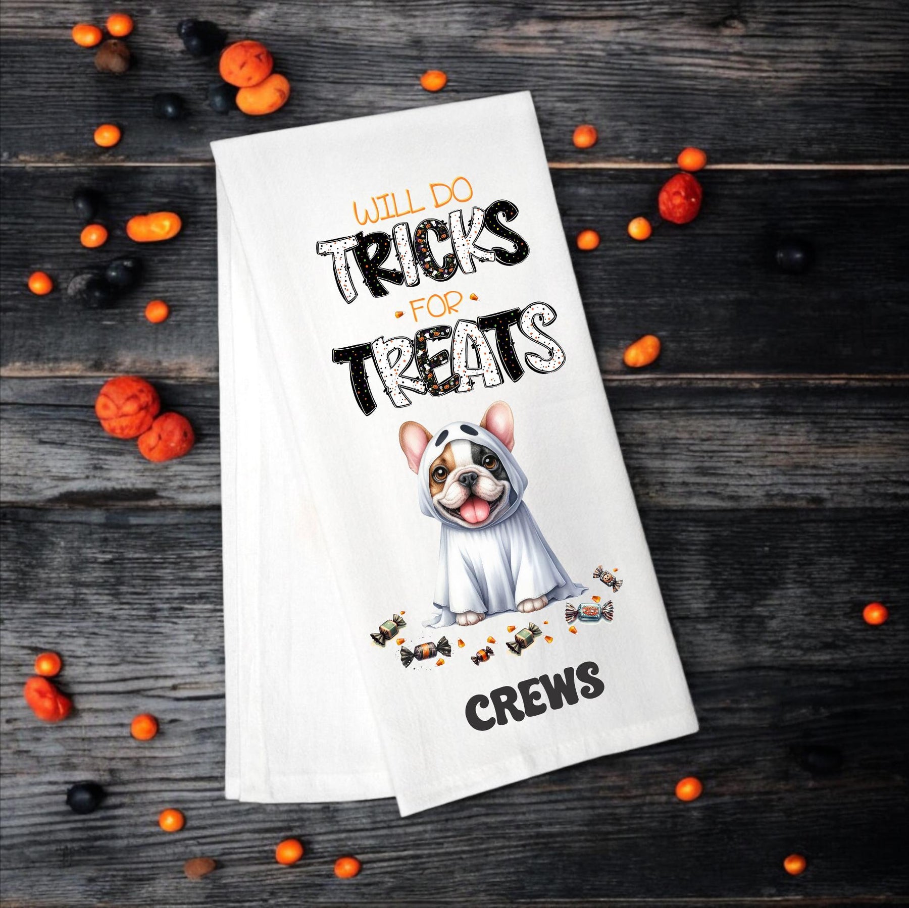 Bring some fun to your kitchen with our "Will Do Tricks for Treats" French Bulldog Tea Towel! Perfect for any Frenchie mom, this adorable flour sack towel features a playful French Bulldog eager to perform tricks for treats, making it a must-have kitchen towel for dog lovers. Ideal for drying dishes or adding a festive touch to your Halloween decor, this high-quality dish towel is both practical and charming. It also makes an excellent dog lover gift, sure to delight any French Bulldog enthusiast. Celebrate your love for Frenchies and enhance your home with this unique dog Halloween decor!
