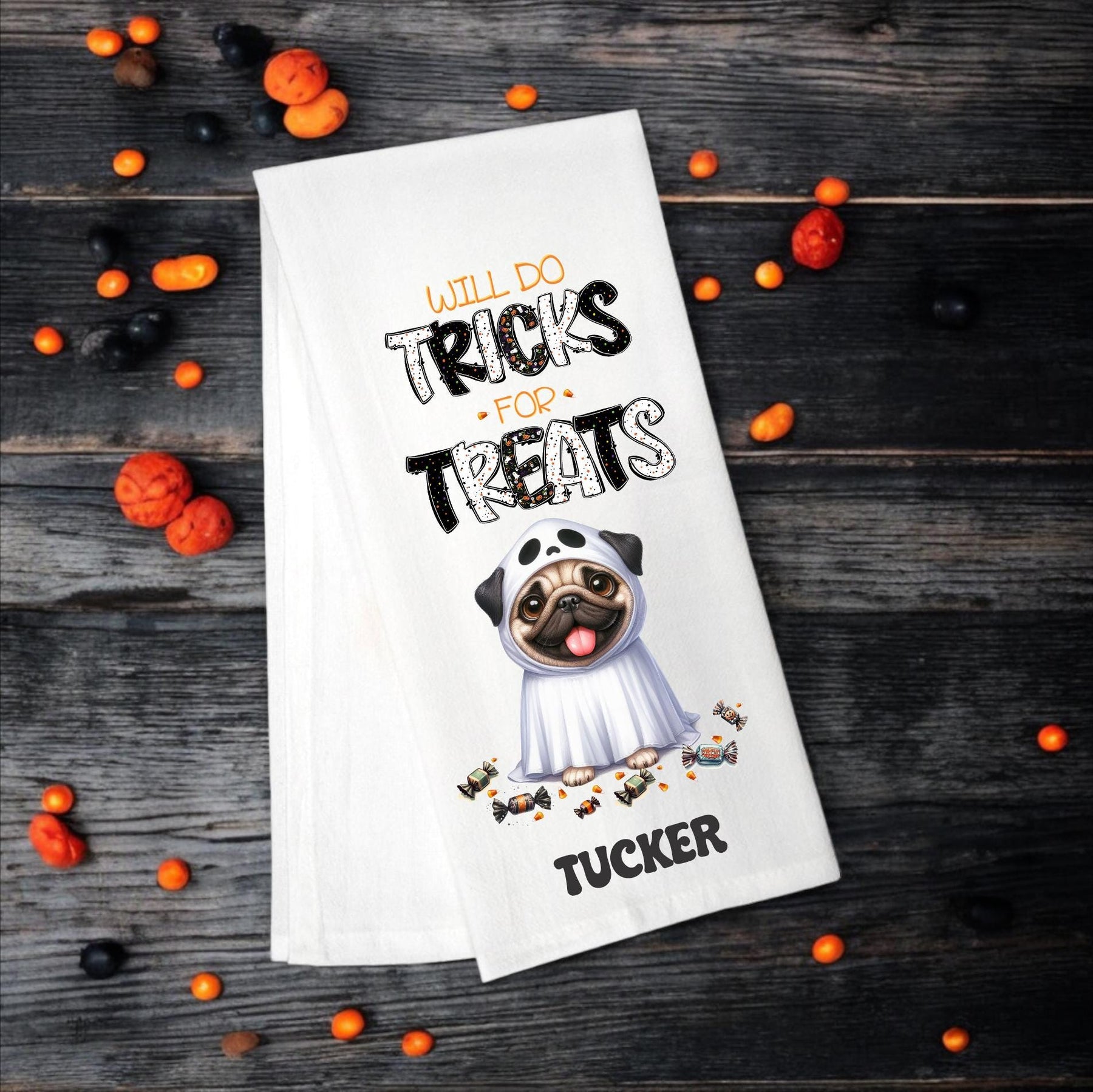 Add some whimsy to your kitchen with our "Will Do Tricks for Treats" Pug Dog Tea Towel! Perfect for any Pug mom, this adorable flour sack towel features a playful Pug ready to perform tricks for treats, making it a must-have kitchen towel for dog lovers. Ideal for drying dishes or adding a festive touch to your Halloween decor, this high-quality dish towel is both functional and charming. It also makes a fantastic dog lover gift, sure to bring a smile to any Pug enthusiast. Celebrate your love for Pugs and enhance your home with this unique dog Halloween decor!