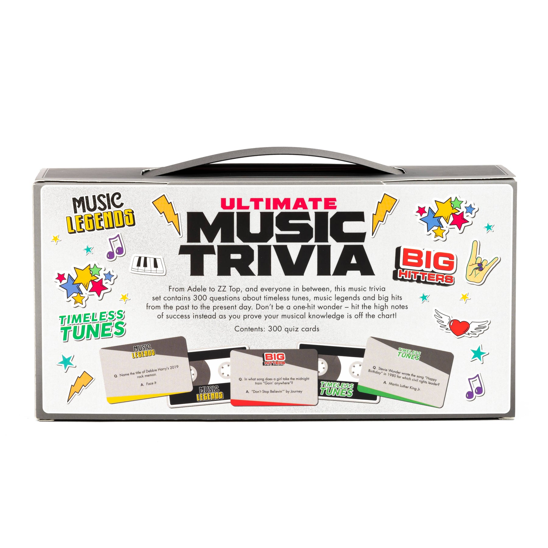 From Adele to ZZ Top, and everyone in between, this music trivia set contains 300 questions about timeless tunes, music legends and chart-toppers from the past to the present day. Don’t be a one-hit-wonder – hit the high notes of success instead with this ultimate music battle!